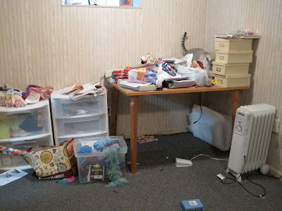 And here is the other end of the room, still waiting to be sorted and purged.  Agh!  I feel like I'm on that show "Hoarders" -- it's embarrassing!  And yes, that is one of my kitties making a guest appearance.  She was "helping" me.