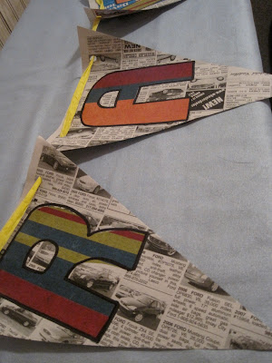 I used spray adhesive to attach the letters to the newspaper, then outlined them in black sharpie to make them stand out. I punched two holes in each triangle to feed ribbon through.