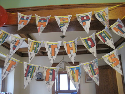 I very firmly believe that birthday's should be celebrated wholeheartedly no matter how old you get. Just because we're not kids any more doesn't mean we don't want cake, balloons, or games! For my husband's birthday today (Happy Birthday, Travis!) I wanted his day to start out with a smile, so I whipped up a little banner out of newspaper and wrapping paper.