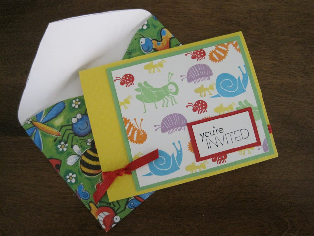 Heather is new to stamping, and was a little intimidated - but she did PERFECTLY! In fact, she ended up doing all the stamping (every single one of those colored bugs!) while I did the cutting and assembling. I think the insides of the invites look really cute, too!