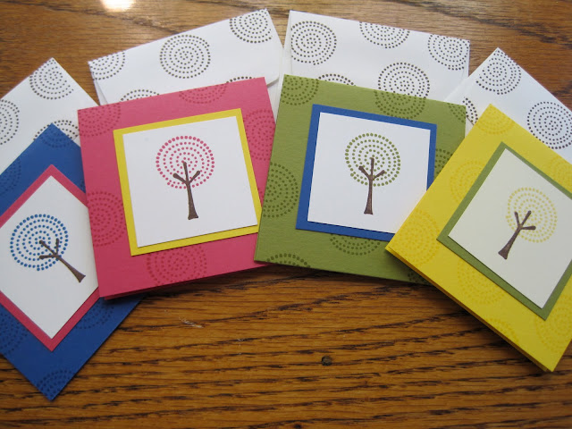 I took advantage of the Two Step promotion myself and picked up the Trendy Trees stamp set. It's been on my wish list forever! I made up a couple of mini card sets using this set. Have I mentioned how much I LOVE making these little 3x3 cards?! : )