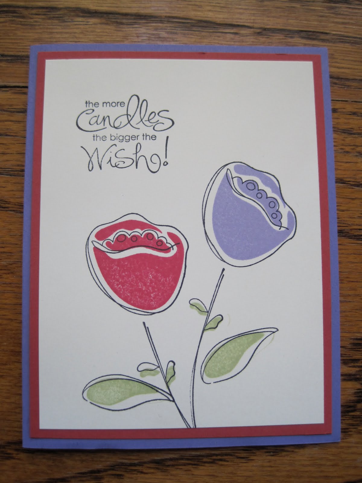 Supplies used ("the more Candles Card"): Awash with Flowers and Whimsical Words (SAB 2010) stamp sets, cardstock in Very Vanilla, Rose Red and Lovely Lilac, inks in Basic Black, Rose Red, Lovely Lilac and Certainly Celery.