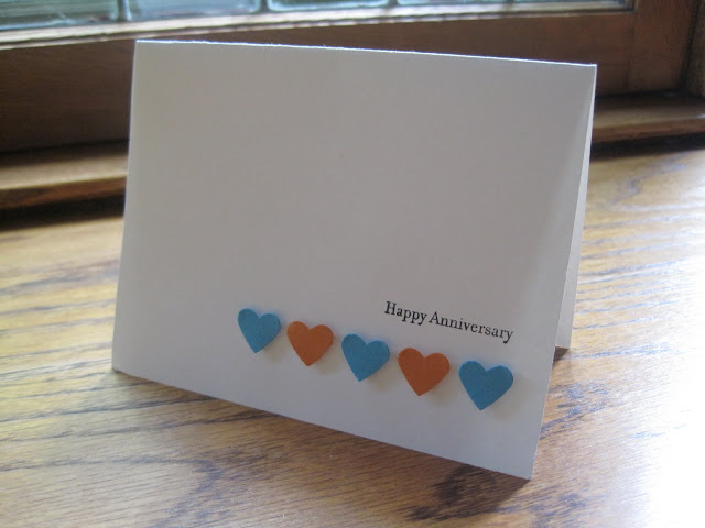 Our wedding was on the beach, and our colors were turquoise and orange, so I used my small heart punch to punch out five hearts in those colors and stamped "Happy Anniversary" above them. Simply stated.