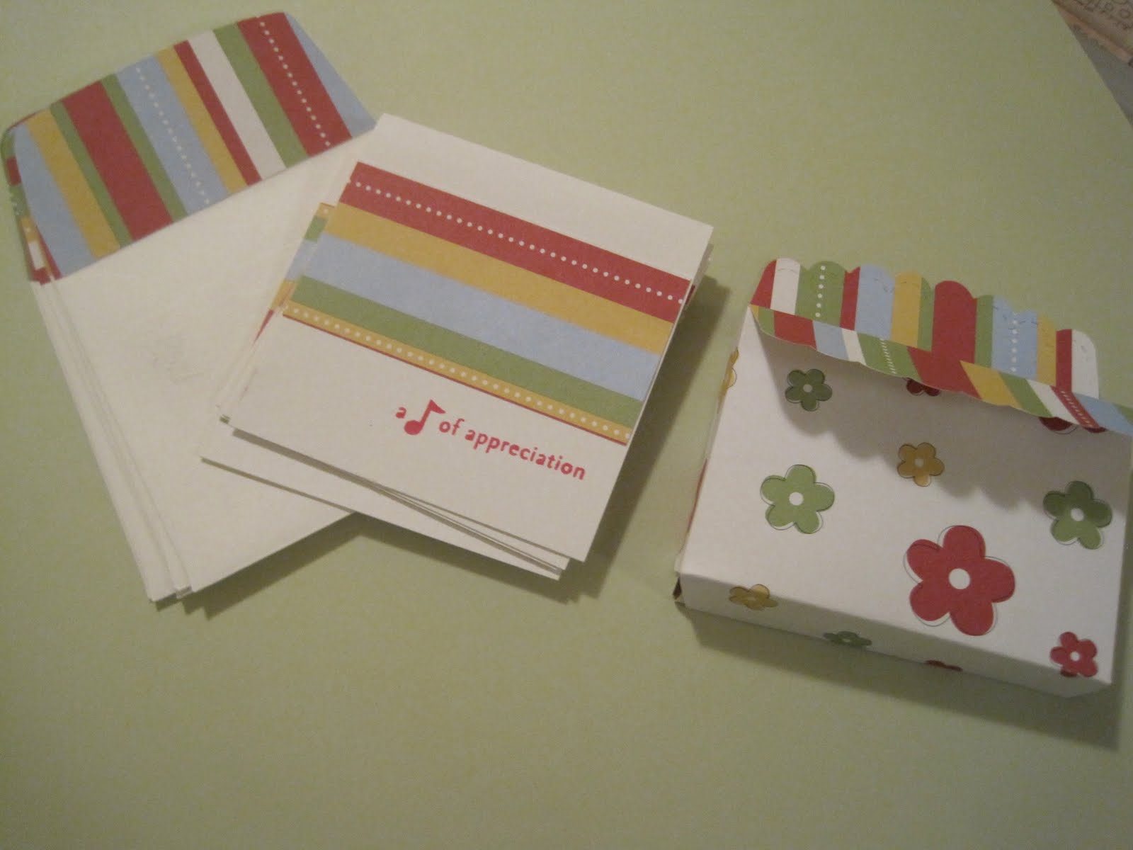 I made a little set of 3x3 notecards with envelopes that fit into a little gift box. I used some retired designer series paper, the scallop envelope die for the Big Shot, and the "Picture This" stamp set fom the Occasions Mini Catalog...