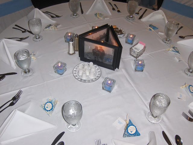 I love the triangular theme that carries through the table -- the favors, photo centerpieces, and napkin folds.